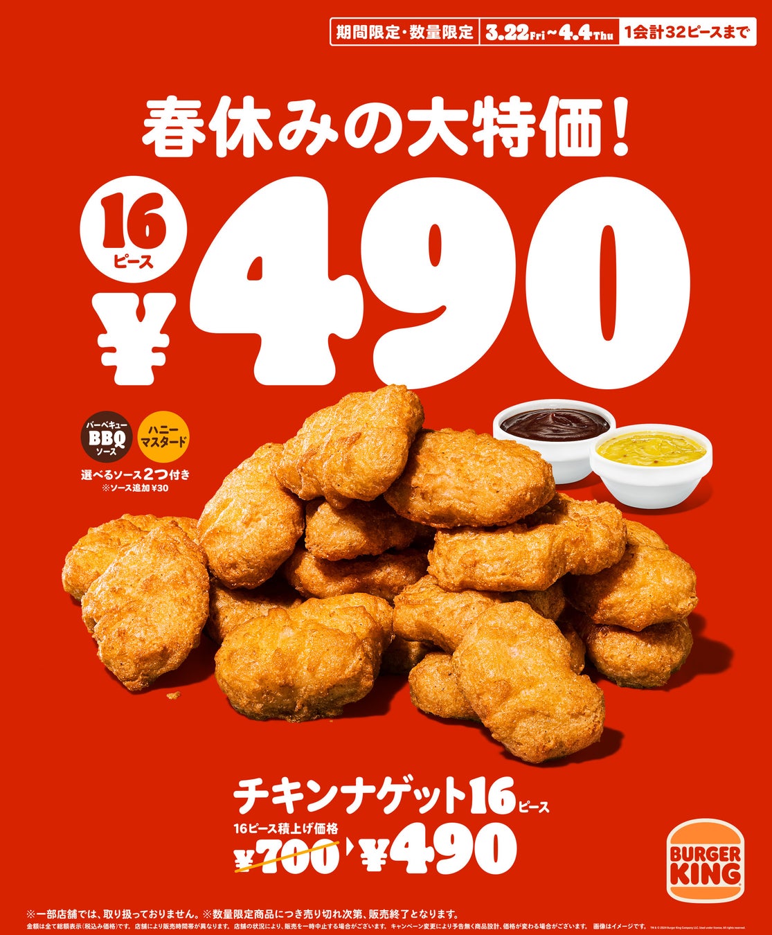 ぜひこの機会に、ご家族やご友人と、また、おひとり様でも、春休みの大特価『チキンナゲット16ピース』をお得にお楽しみください。