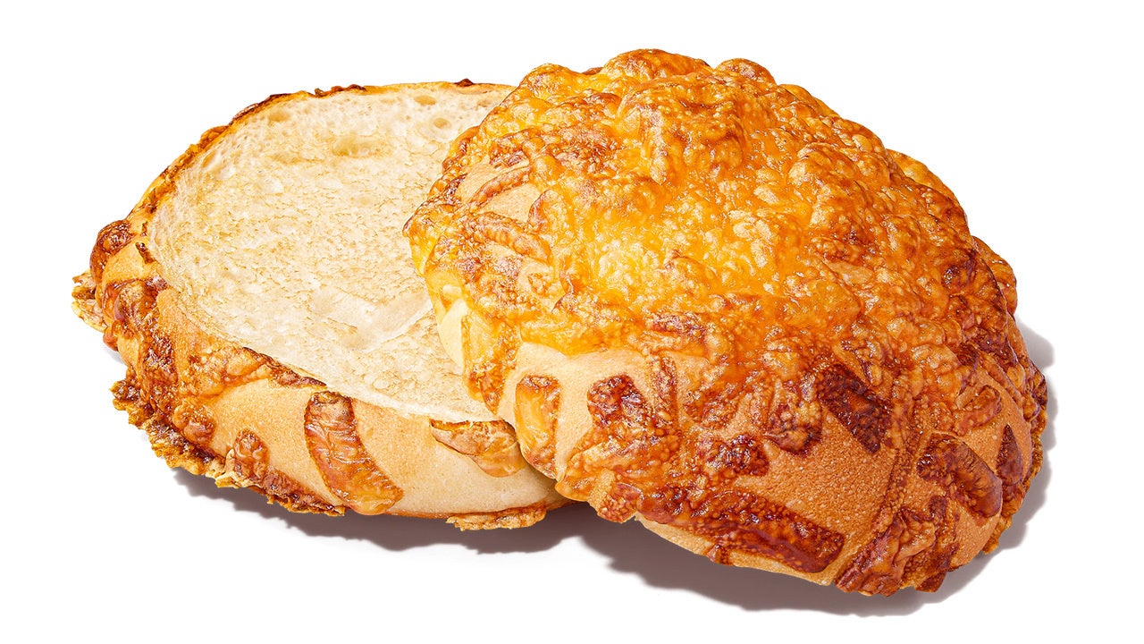 2商品に採用した“4種チーズのクラフトバンズ”は、発酵前のパン生地に爽やかな酸味のゴーダチーズ、マイルドなエグモントチーズ、ほのかな甘みのモッツァレラチーズを均一に付けて発酵させ、さらにもう一度、手作業でチェダーチーズを重ねて丁寧に焼き上げています。そのため、手作業が多く、通常のバンズに比べ1/3程度の数量しか生産できません。