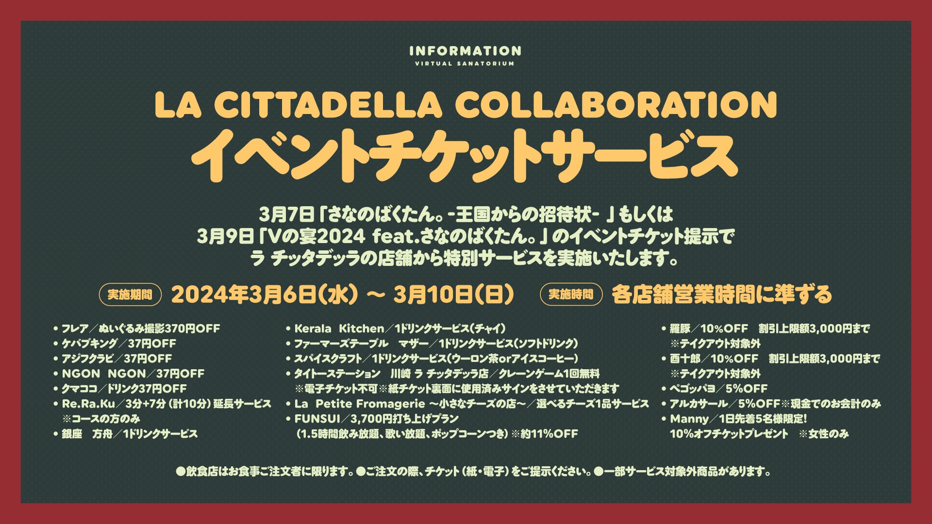 川崎駅前の複合商業施設「ラ チッタデッラ」(神奈川県川崎市川崎区小川町/運営:株式会社 チッタ エンタテイメント/代表取締役社長:美須アレッサンドロ)では、バーチャルYouTuber「名取さな」とのコラボレーションイベント『さなのばくたん。-王国からの招待状‐ LA CITTADELLA COLLABORATION』を2024年3月1日(金)から3月24日(日)まで開催します。今年で第4回目となるコラボレーションでは、恒例の「さなのばくたん。レストラン」や特別展示、CD販売、イベントチケットサービスの他、今回初となるクラブチッタでの後夜祭も実施予定です。ファンの皆様と共に楽しい時間を共有できる様々なイベントや企画をご用意いたしましたので、ぜひこの機会にお楽しみください。