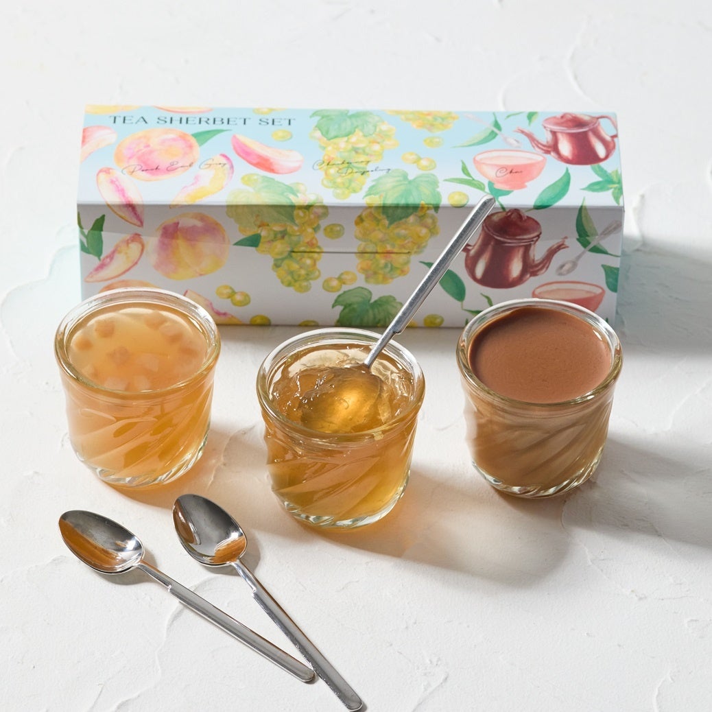 同じく期間限定の「ティーシャーベット3個セット」は、シャルドネダージリン、チャイ、ピーチアールグレイの3つの香り豊かなティーを凍らせて冷たいシャーベットとして味わう一品。お好みでゼリーやプリンとしても楽しめます。