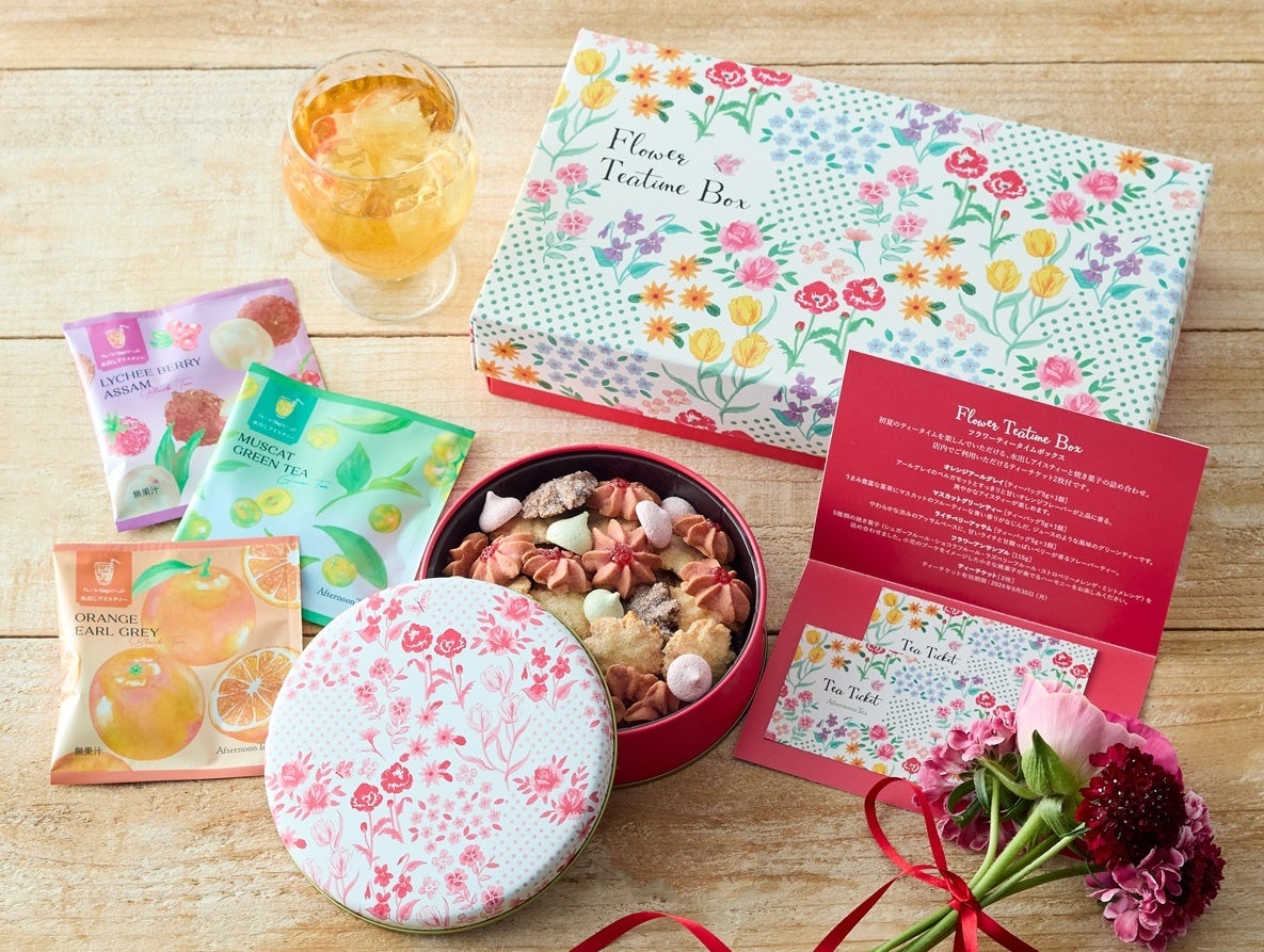 ほのかに甘いライチと甘酸っぱいベリーが香る新作の「ライチベリーアッサム」などフルーティーな水出しアイスティー3種をメインに、5種の焼き菓子をぎゅっと詰めたお菓子缶「フラワーアンサンブル」、店内でご利用いただけるティーチケット2枚をギフトに仕立てた「フラワーティータイムボックス」が、お花を描いた華やかなパッケージで登場。感謝の気持ちを添えて贈る<母の日ギフト>として、期間限定で発売します。