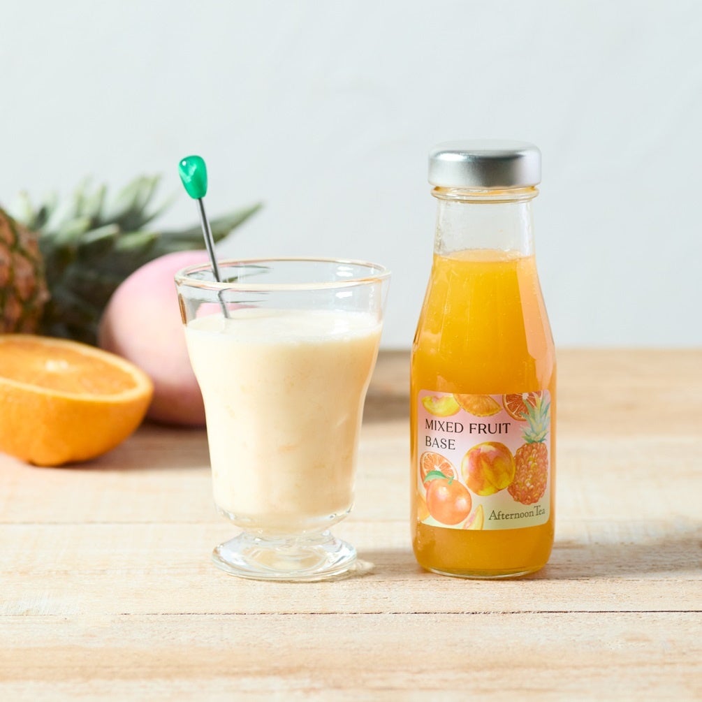 黄桃、みかん、パイナップルをベースに滑らかに攪拌したフルーツミックスベース。牛乳と混ぜるだけで、フルーティーでまろやかなフルーツミックスがお楽しみいただけます。