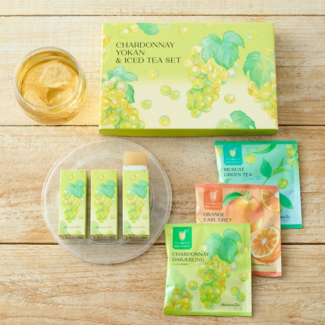 シャルドネ白あん羊羹と、相性のよい3種類の水出しアイスティーの詰め合わせ。羊羹とアイスティーの夏の味わいを、ぜひお楽しみください。