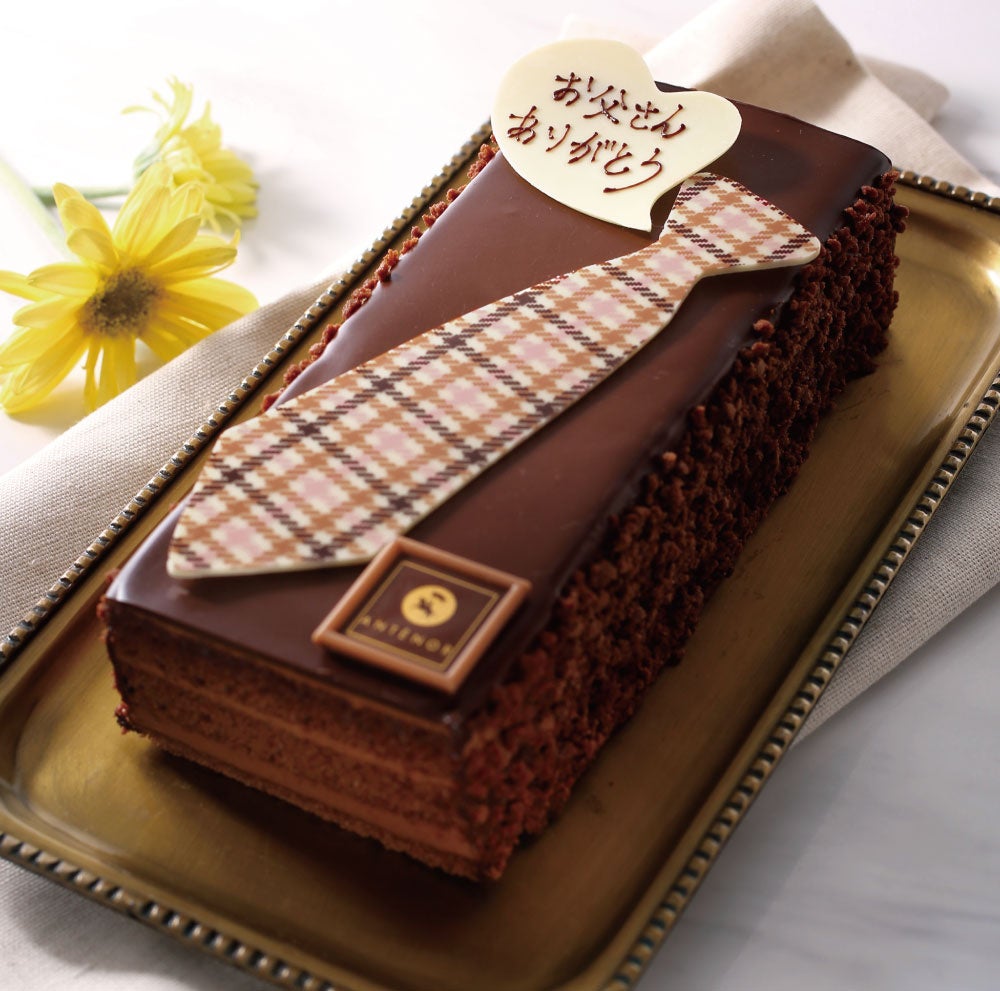 ネクタイをモチーフにした父の日限定のベルギーショコラケーキ。香り豊かなベルギー産クーベルチュールチョコレートのクリームとソフトなチョコスポンジを重ねたシンプルな美味しさのケーキです。なめらかな口どけをお楽しみください。