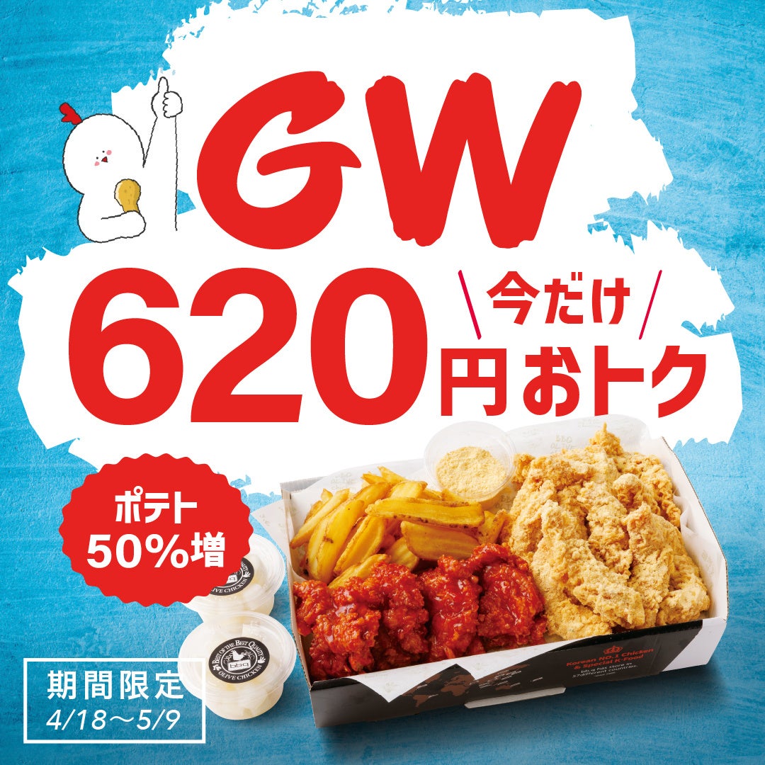 ゴールデンウィーク中だけ620円オトク!骨なしデラックスボックスがお値段そのままにポテト50%増量中|bb.q オリーブチキンカフェ 川崎西口店