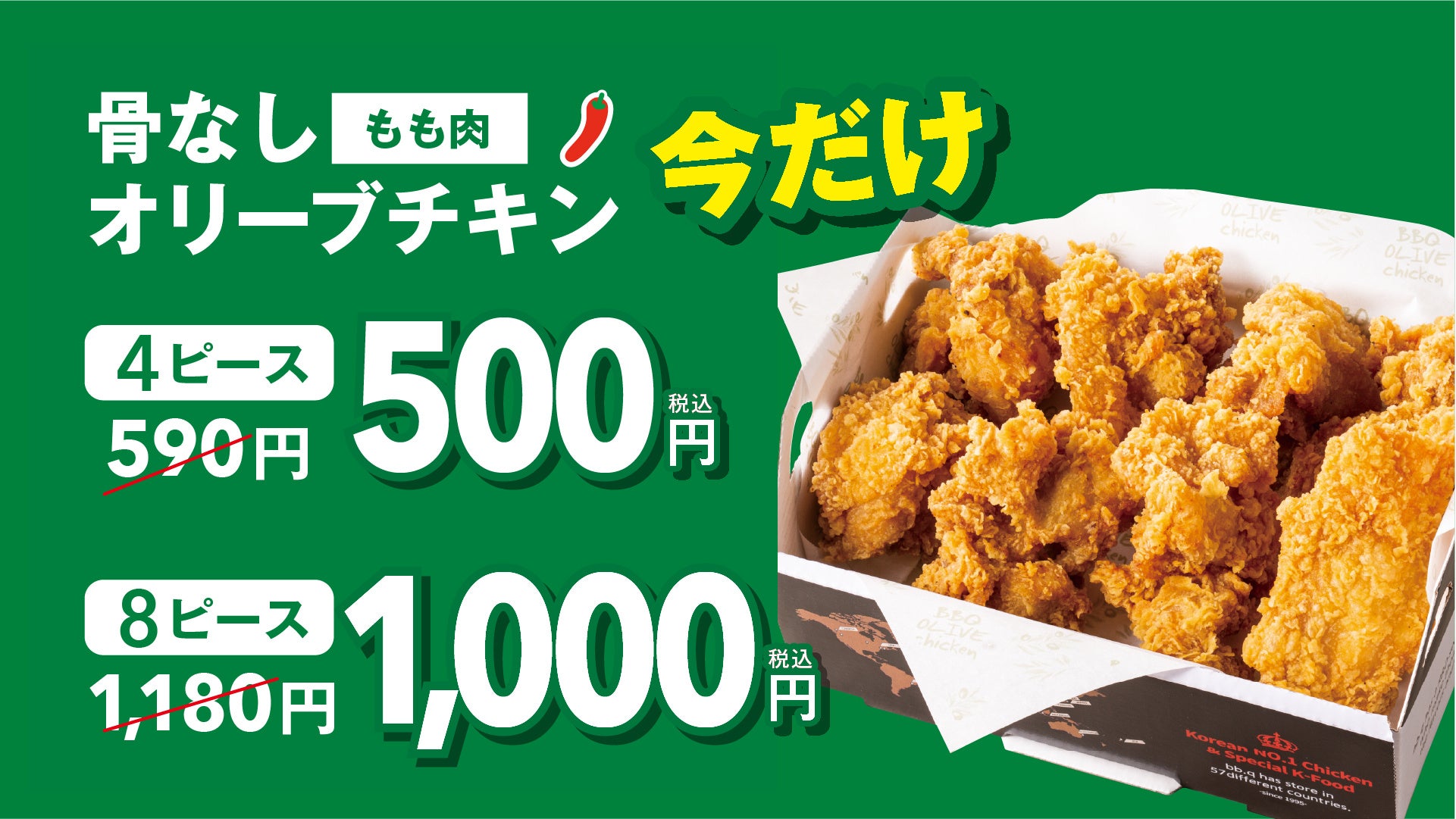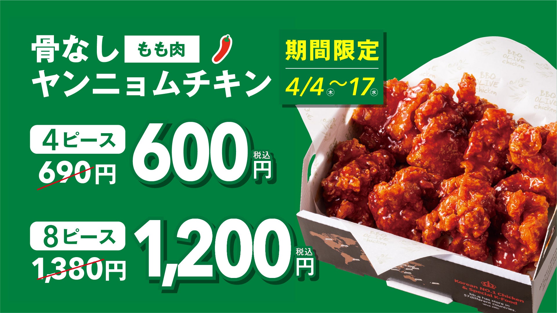 韓国No.1 フライドチキンブランド『bb.q オリーブチキンカフェ(以下、オリーブチキンカフェ)』は、「骨なしオリーブチキン500円キャンペーン」を4月4日(木)~4月17日(水)の2週間で実施いたします。