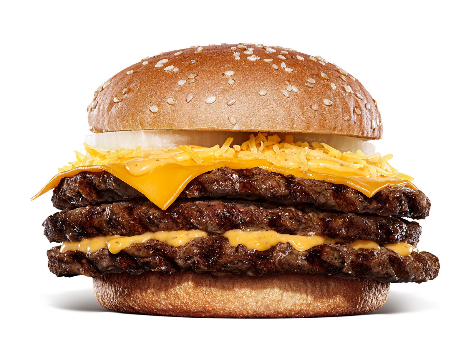『チーズ&チーズ ビッグマウスバーガー』は、直火焼きの100%ビーフパティ3枚とオニオンに、クリーミーな特製チーズソースとコクのあるチェダーチーズスライス、さらに3種類のチーズをブレンドしたシュレッドチーズを重ねました。ビーフパティ3枚に4種類のチーズを贅沢に使用した、濃厚でリッチな旨さをお楽しみいただけます。
