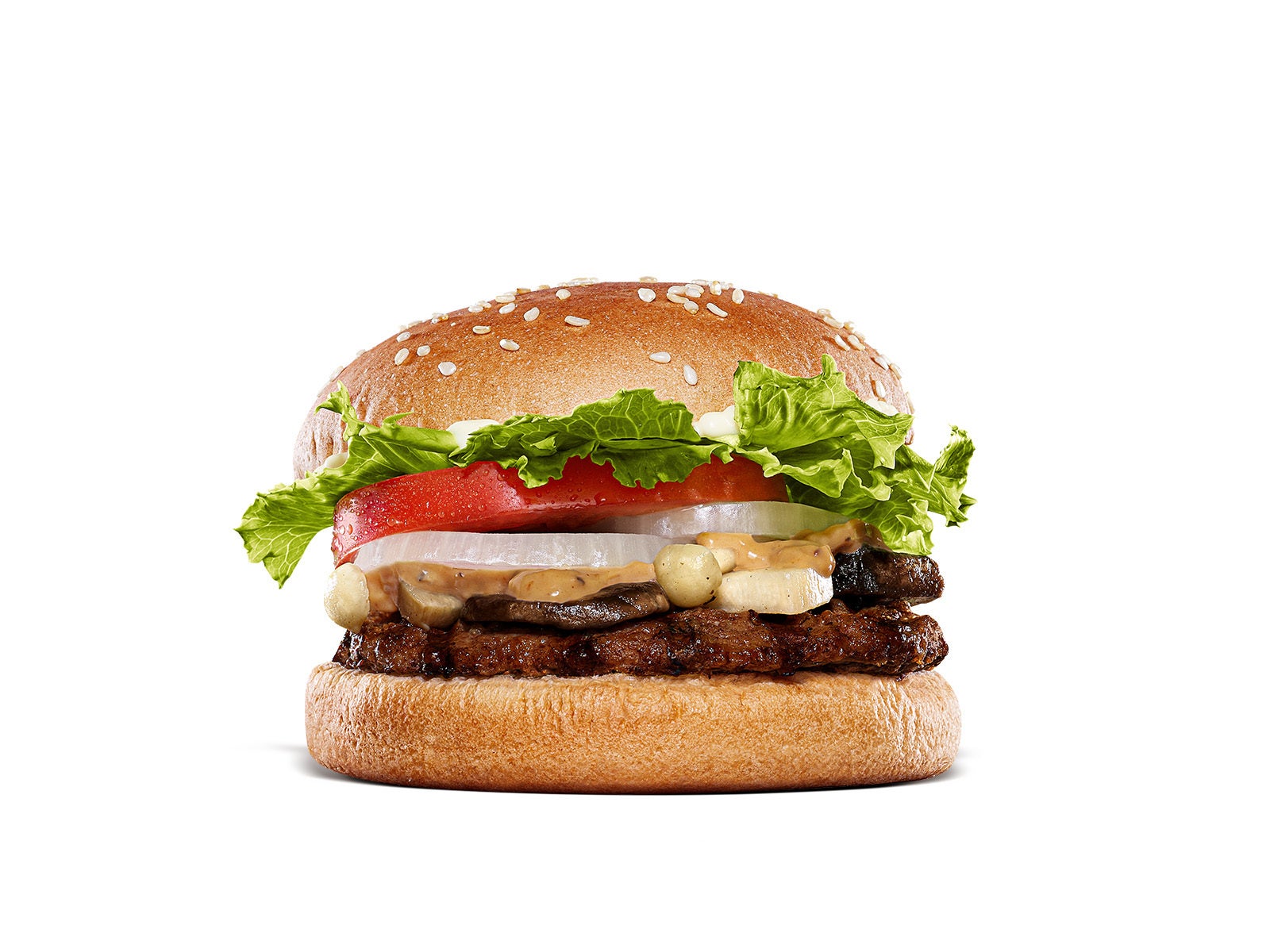 『マッシュルームワッパー® 』は、直火焼きの100%ビーフパティに、ローストした2種類のマッシュルームとエリンギ、ぶなしめじの4種のきのこを贅沢に使用し、フレッシュなレタス、トマト、オニオンを重ねました。さらに粗挽きブラックペッパーを効かせ、焦がし醤油とクリーミーなプレミアムペッパーマヨソースを合わせた、香り高いきのこの旨味を楽しめる本格バーガーです。