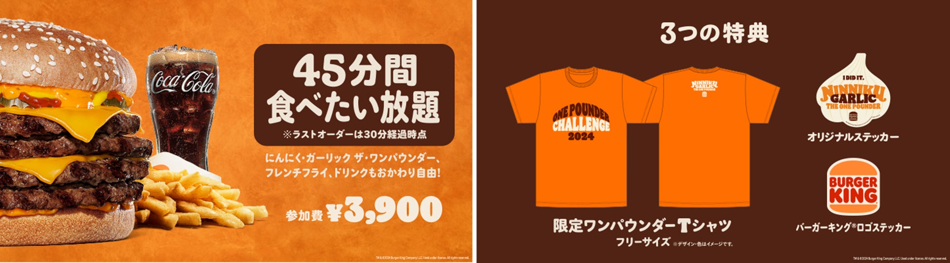 『にんにく・ガーリック ザ・ワンパウンダー』、フレンチフライ(M)、ドリンク(M)各商品を、それぞれ完食していることを条件に、いずれも制限時間45分以内でおかわり自由の食べたい放題イベントです。