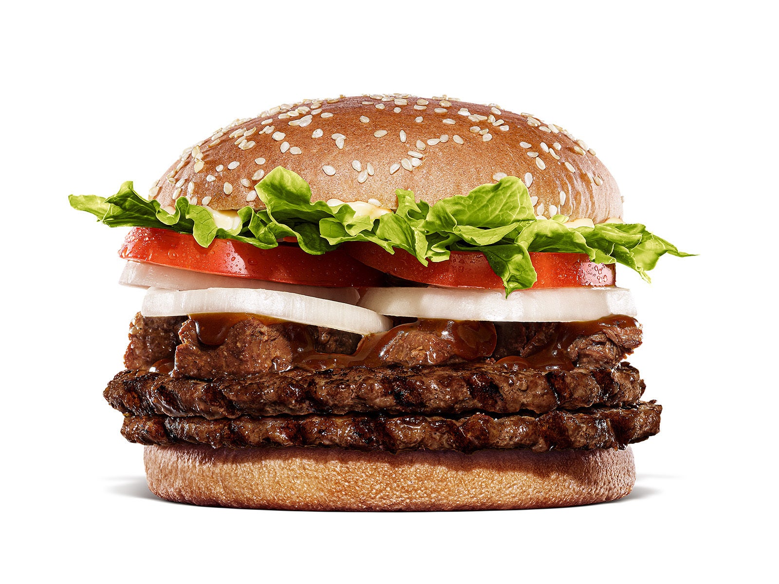 『ダブルステーキソースワッパー® 』は、バーガーキング® 自慢の直火焼きの100%ビーフパティ2枚と赤身と脂身のバランスがとれたジューシーなアメリカ産角切り牛肩ロースに、フレッシュなレタス、トマト、オニオンの豊富な野菜を重ね、クリーミーなマヨソースと、オニオンパウダーと炙り醤油の香りが加わったガーリック香る炙り醬油風ソースで仕上げた、ボリューム満点のプレミアムなバーガーです。