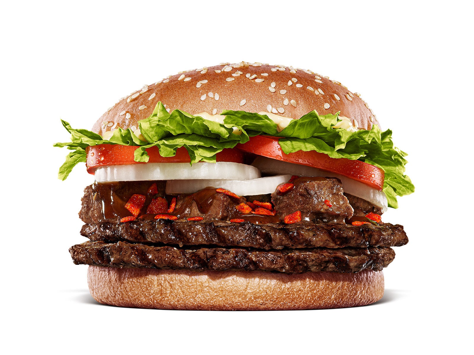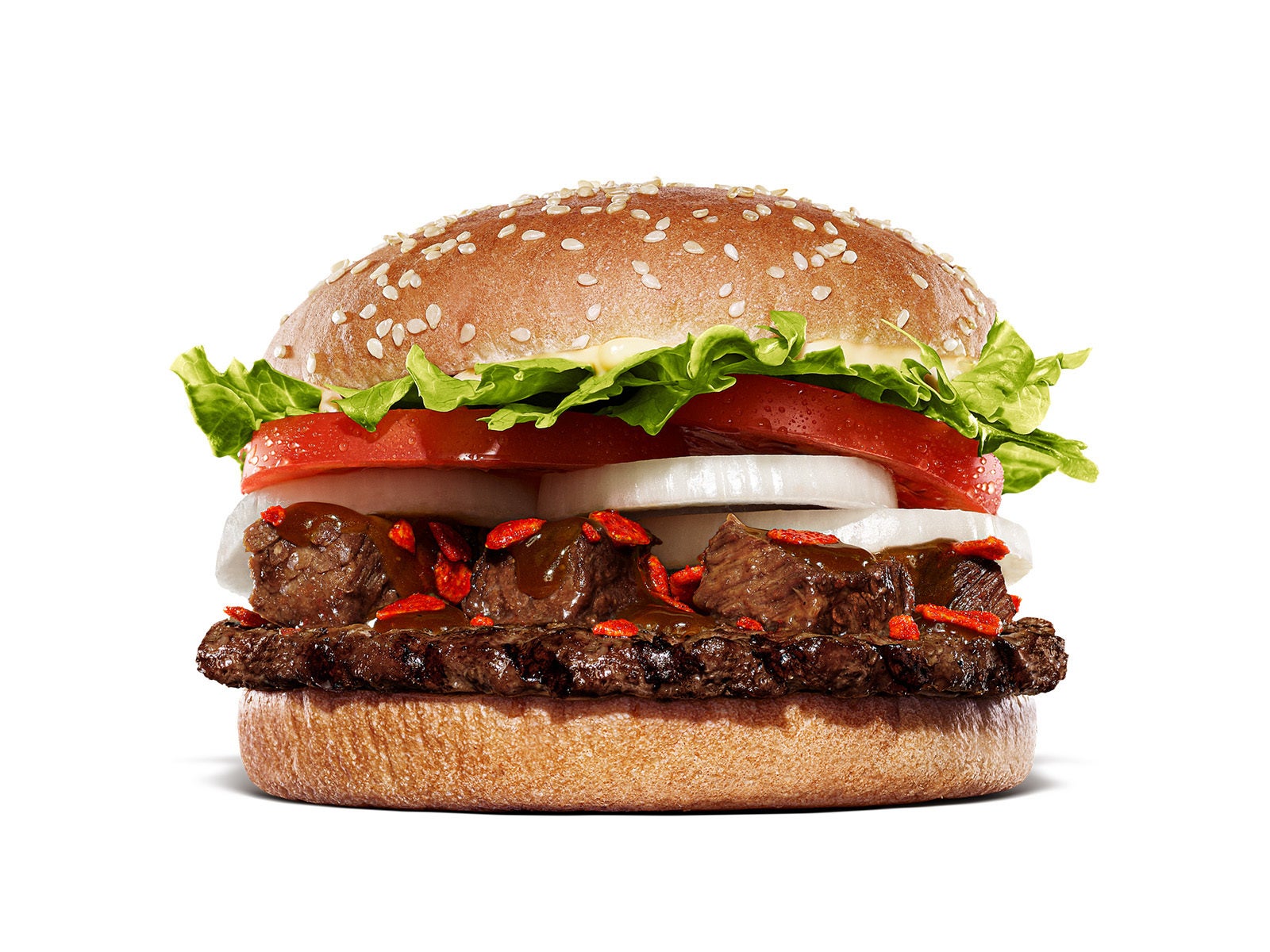 『ダブルスパイシーステーキソースワッパー® 』は、バーガーキング® 自慢の直火焼きの100%ビーフパティ2枚と赤身と脂身のバランスがとれたジューシーなアメリカ産角切り牛肩ロースに、スパイシーガーリックフレーク、フレッシュなレタス、トマト、オニオンの豊富な野菜を重ね、クリーミーなマヨソースと、オニオンパウダーと炙り醤油の香りが加わったガーリック香る炙り醬油風ソースで仕上げた、食欲そそられる旨辛なプレミアムなバーガーです。