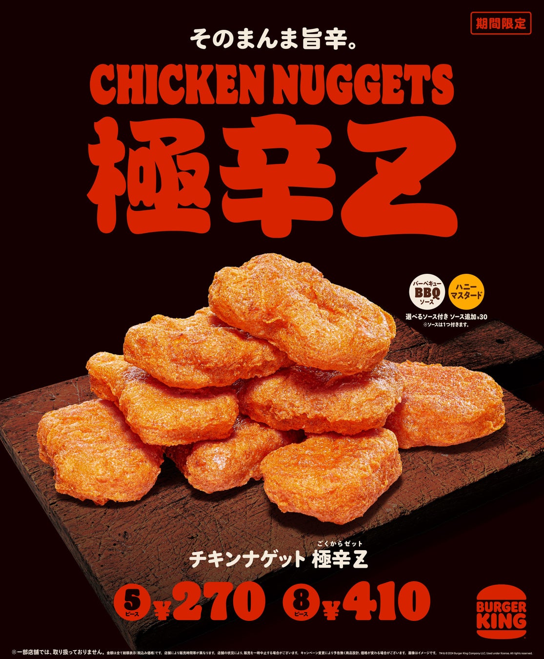 辛いもの好きの皆様も、バーガーキング® ファンの皆様も、そのまま食べても旨くて辛い本格的なおいしさ『チキンナゲット極辛Z』を、ぜひお好きなバーガーと一緒にお楽しみください。