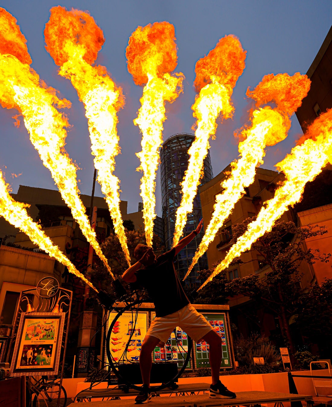 会場のあちこちから立ち上る炎、夜空を彩る華やかなライティング演出も加わり、熱気を帯びた迫力のパフォーマンスが来場者の全身を刺激します。奇想天外な演出と迫力満点のパフォーマンスは、外国人に大人気です。