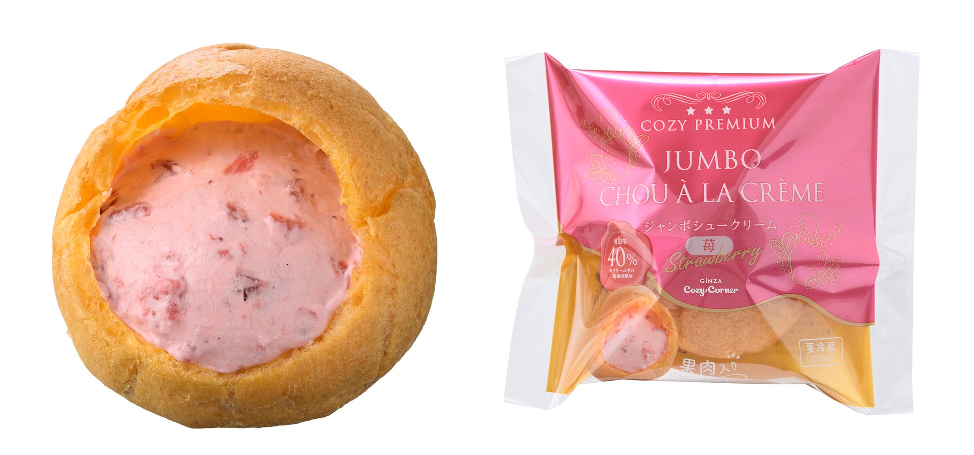 今年の1~3月に発売した「コージープレミアムジャンボシュークリーム(苺)」は、苺の果肉感と苺本来の甘ずっぱさを生かしたクリームが大好評でリピーターが多く、SNSでも話題に上った人気商品。これを受けて、このたび11月15日から再び登場いたします!