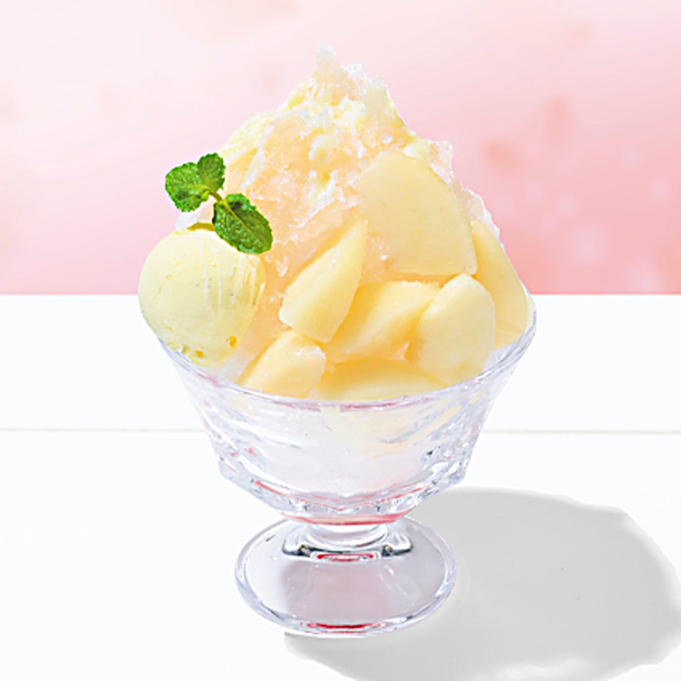 特長:ひんやりかき氷に上品な甘みと香りのピーチシロップをかけ、みずみずしい果肉を添えました。練乳の濃厚なコクが、桃の爽やかな味わいとよく合います。