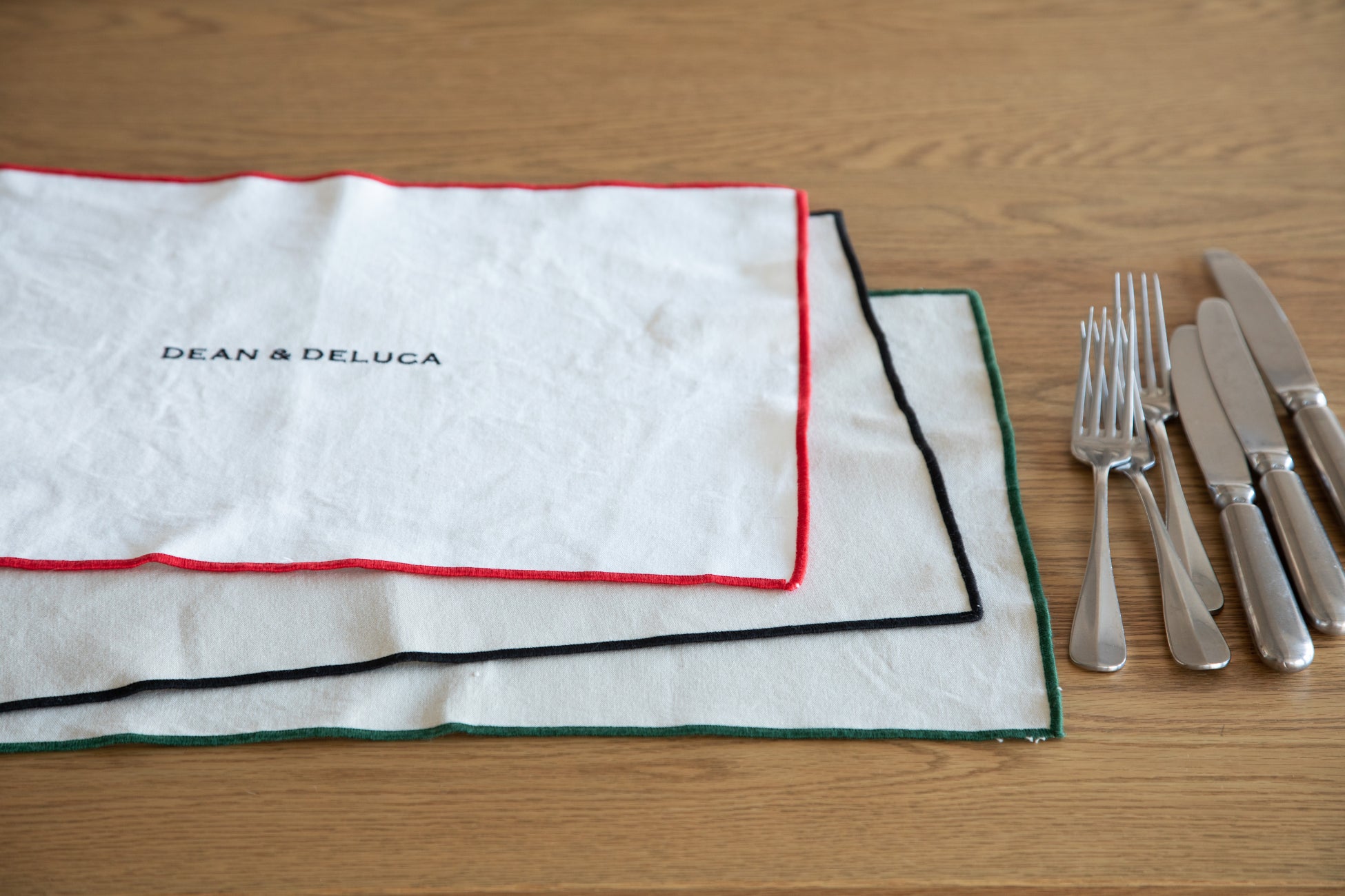 コシが強く柔らかいコットン生地の縁をオーバーロックステッチで仕上げたリネン。縁どりが食卓を引き締める3色展開で、色鮮やかな直線に走ったラインが食卓にニュアンスを与えます。