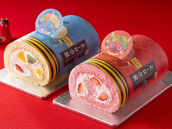 ご家族でお楽しみいただける「節分ロールケーキ」は、ふんわり軽いスポンジ生地で旬の苺やフルーツを巻き上げた紅白2色のロールケーキを、節分らしく赤鬼・青鬼の巻紙でラッピング。ぜひ2本セットで並べて節分気分を盛り上げるとともに、2色を食べ比べてお楽しみください。
