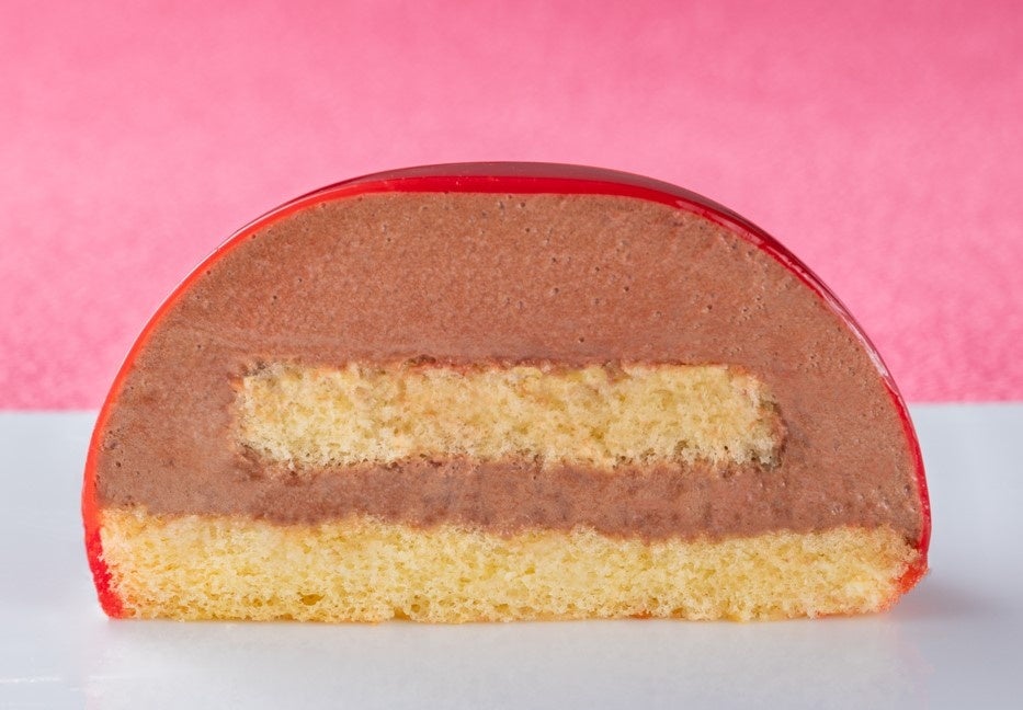 ヘーゼルナッツのプラリネを混ぜ込んだチョコレートムースに赤いグラッサージュをコーティングしました。