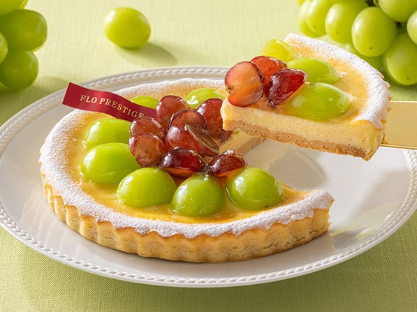 瑞々しく豊潤なシャインマスカットとすっきりとした甘さの赤葡萄をバランスよく盛り付けた直径約14~15cmのホールタルトを、FLOの日限定価格・税込1,285円で販売いたします。
