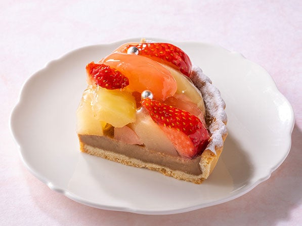 アールグレイが香るタルト台に、アプリコットと2色の桃(白桃・グレナデンシロップに漬けた白桃)のコンポートと苺を彩りよく盛りつけた、6月6日(木)「FLOの日」限定で楽しめる大変お得なタルトです。紅茶ダマンド台は、時間が経っても焼きたてのような“サクサク食感”をお楽しみいただけます。