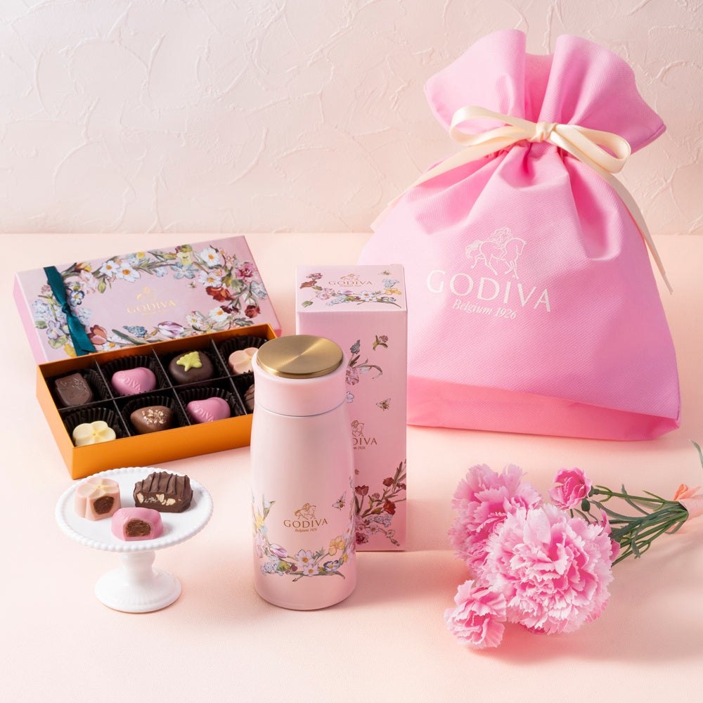 “ありがとう”の気持ちを伝える、「花咲く春 アソートメント 8粒入」とのギフトセットには、お花形や新緑の葉っぱをデコレーションした限定チョコレートなど、見た目にも華やかなチョコレートを詰め合わせたピンクのラッピング袋には、ゴディバオリジナル柄のステンレスボトルも入っています。