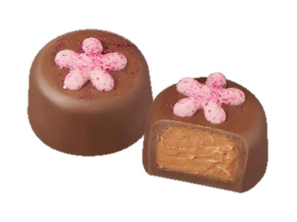 口の中でとろけるような、クリーミーなキャラメルガナッシュをミルクチョコレートで包み、可愛いらしいピンクの花形のチョコレートとグリッターで飾りました。
