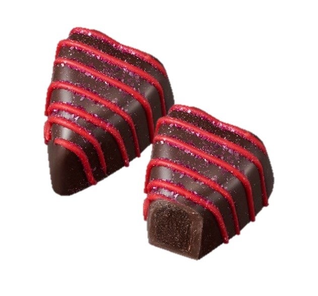 ダークチョコレートのガナッシュをハート形のダークチョコレートで包み、レッドのラインで飾りました。カカオの風味が存分に味わえるひと粒です。