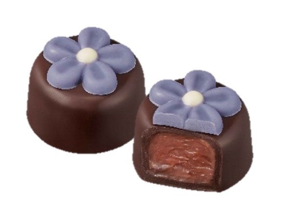 カシスムースのガナッシュをダークチョコレートで包み、花形のチョコレートで飾りました。爽やかなカシスとチョコレートの調和が楽しめるひと粒です。