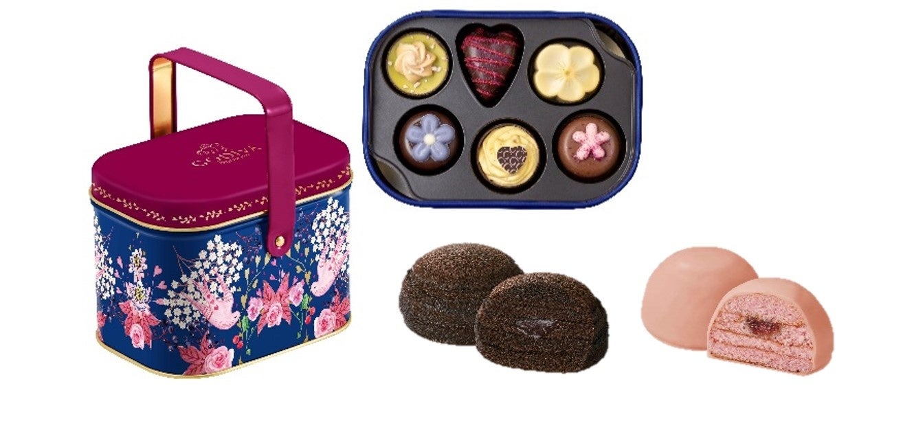 幸せを運ぶ小鳥たちやキュートな花々などを描いたハート形のパッケージに、まるでブーケのような6種類の限定チョコレートなどを詰め合わせました。