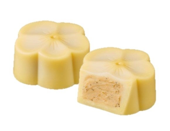 味わい深いバニラアーモンドプラリネを、花形の淡い黄色のホワイトチョコレートシェルで包みました。まろやかな優しい美味しさが味わえます。