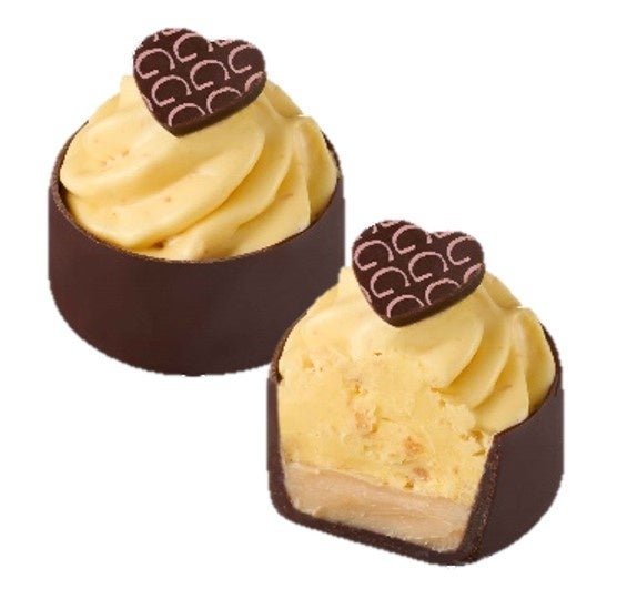 甘酸っぱいパッションフルーツのガナッシュをダークチョコレートカップで包み、黄色いムースで閉じ込めました。ゴディバの「G」をデザインしたハートのプレートをトッピング。