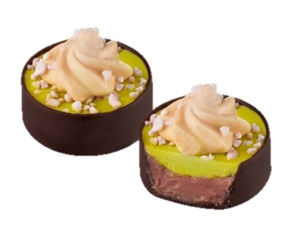 ベリーのガナッシュをダークチョコレートカップで包み、ピンクのメレンゲのチップとムース状のチョコレートで飾りました。ローズとベリーの香り高いひと粒です。