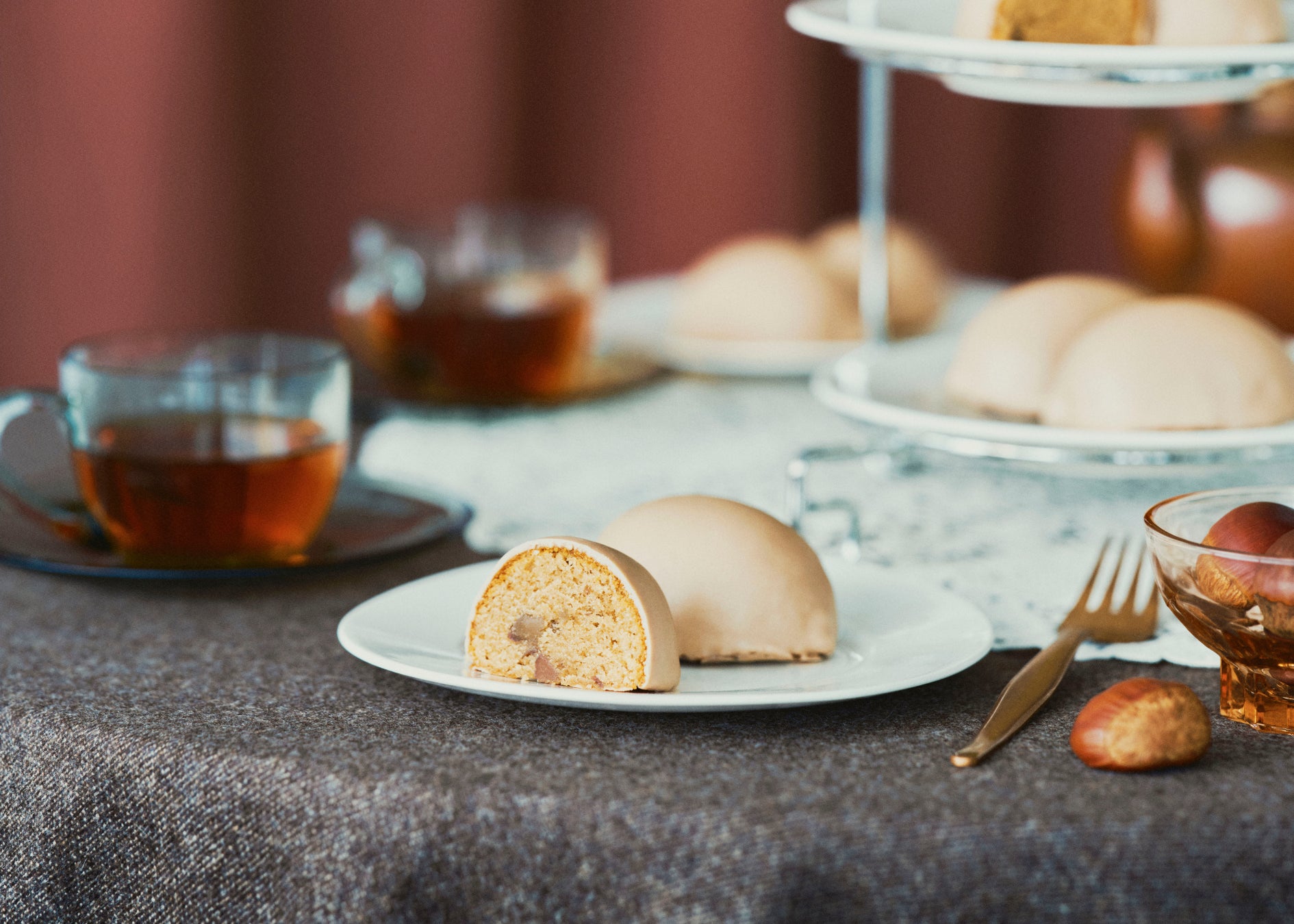 治一郎ならではのしっとりとした生地に、イタリア産マロンのペーストをふんだんに練り込み焼き上げました。マロンに合わせたのはラム酒とバニラの風味。香り高く奥深い味わいが、口の中でふわっと広がります。グレーズには、砕いたマロングラッセとカシス果汁を忍ばせ、上品なマロンの甘さが豊かに引き立つ、深まる秋にぴったりな味わいのバウムクーヘンに仕上げました。