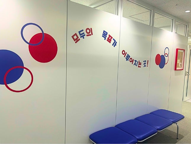 韓国の国旗の色にもある赤と青が川崎駅前校のテーマカラー 。