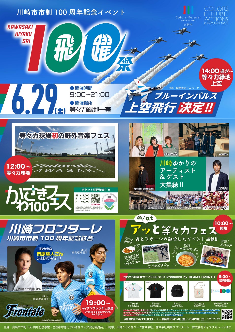 等々力球場で日中に行う「かわさき100フェス」のほか、1日を通じて等々力緑地一帯で各種スポーツ体験や食を楽しめる「アッと(@/at)等々力フェス」、一日の締めくくりは、「川崎フロンターレ市制100周年記念試合(19時キックオフ 対サンフレッチェ広島)」が行われます(別添、「飛躍祭ポスター」参照。)。