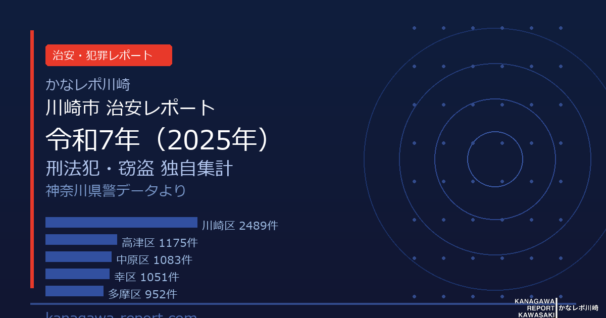 神奈川県警察が公開するデータをもとに、川崎市内で令和7年(2025年)に発生した犯罪の発生状況をかなレポ川崎が独自に集計しました。
