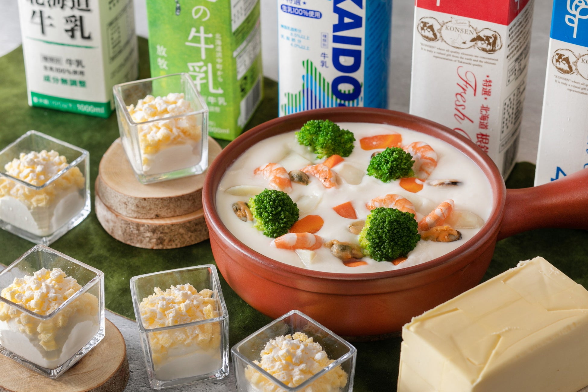 第1テーマは「生乳」。厚岸(あっけし)群浜中町は、人口の倍以上の乳牛が飼育される、北海道屈指の酪農地帯です。豊かな自然環境で生産された生乳は、高水準な分析・衛生管理を経て製品に加工されます。ブッフェでは、「根釧生クリームを使った海の幸シチュー」やデザートに「食べる生クリーム」などを提供します。