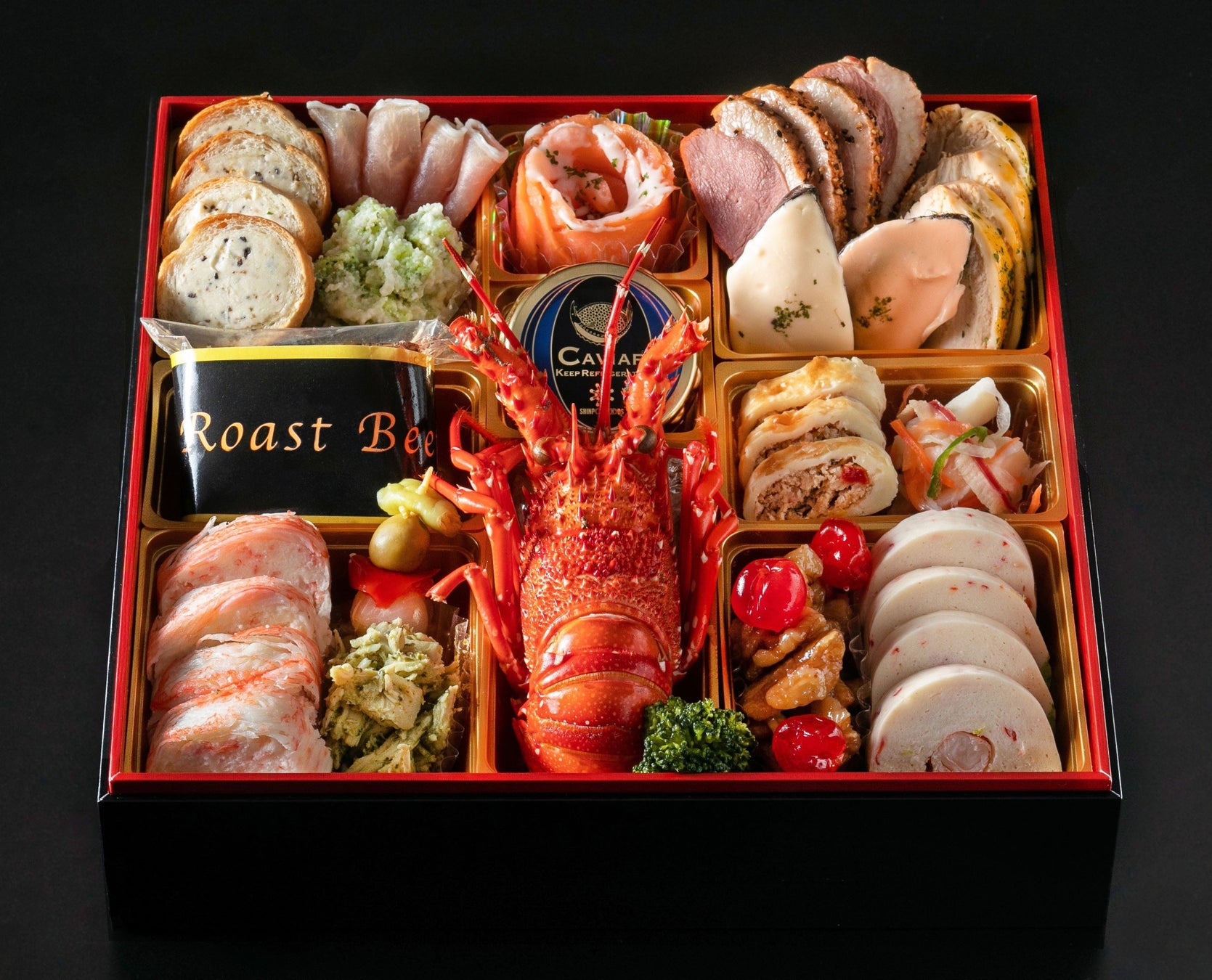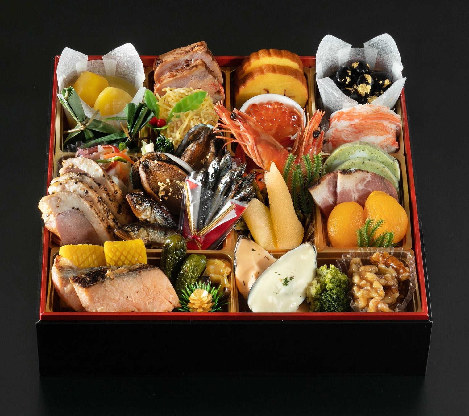 栗きんとん/牛肉笹包み/鶏中華テリーヌ/錦糸玉子包み/伊達巻/なます/いくら醤油漬け/金箔黒豆煮/カニグルメテリーヌ/海鮮ミックスマリネ/合鴨パストラミ/鮑旨煮/小松菜と揚げ煮物/田作り/海老旨煮/数の子/菜の花松前漬/バジル仕立てのチーズロール/黒糖ローストポーク/杏子煮/紅鮭西京焼/烏賊黄金焼/花椒くらげ/ピリ辛小胡瓜/ムール貝冷製オーロラソース/ムール貝冷製マヨネーズソース/ブロッコリーのバジルオイル漬/メープルくるみ/鮎柚子煮
