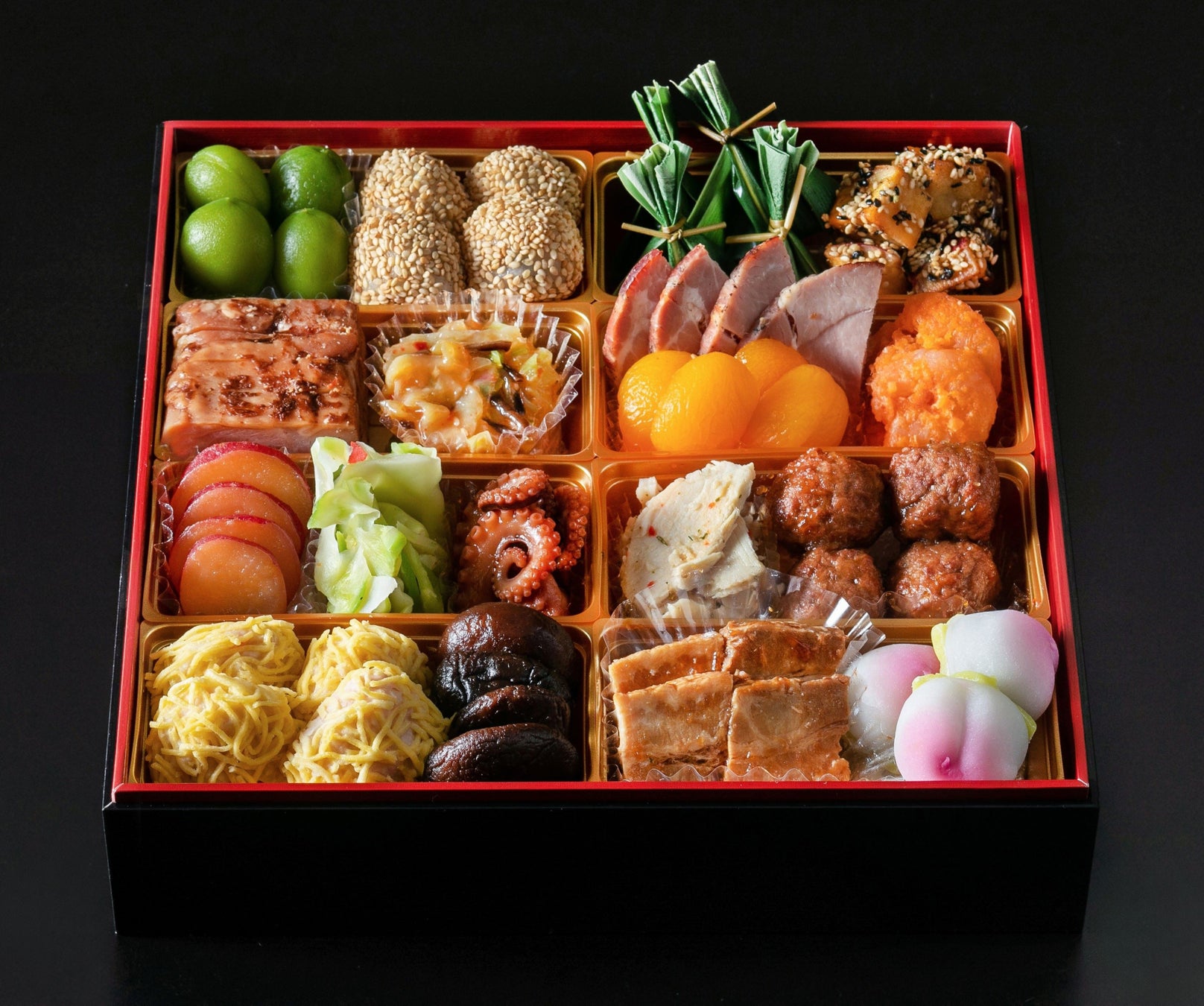 若桃甘露煮/胡麻団子/鶏中華テリーヌ/花椒くらげ/鳴門金時芋レモン煮/ザーサイ/蛸旨煮/錦糸玉子包み/椎茸煮/牛肉笹包み/ごま金時芋/黒糖ローストポーク/杏子煮/海老チリソース煮/桜島どりマリネ/肉団子/豚角煮/桃饅頭