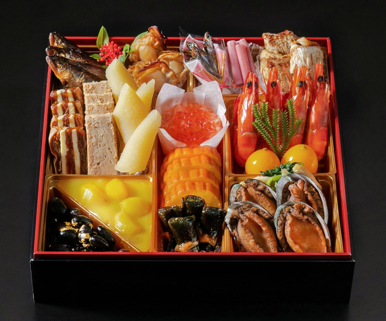 鮎柚子煮/直火焼帆立/柿博多/松風/数の子/栗きんとん/金箔黒豆煮/田作り/ハスの芽梅酢漬/小鯛ひしお焼/帆立たらこ雲丹和え/いくら醤油漬け/伊達巻/一口昆布巻/海老旨煮/金柑甘露煮/小松菜と揚げ煮物/鮑旨煮