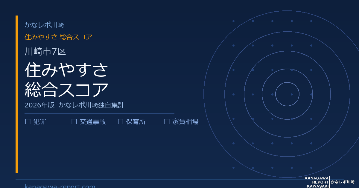 「自分の区は住みやすいのか?」川崎市内7区を犯罪発生率・交通事故・保育所空き率・家賃相場の4指標でかなレポ川崎が独自にスコア化しました(2026年04月更新)。