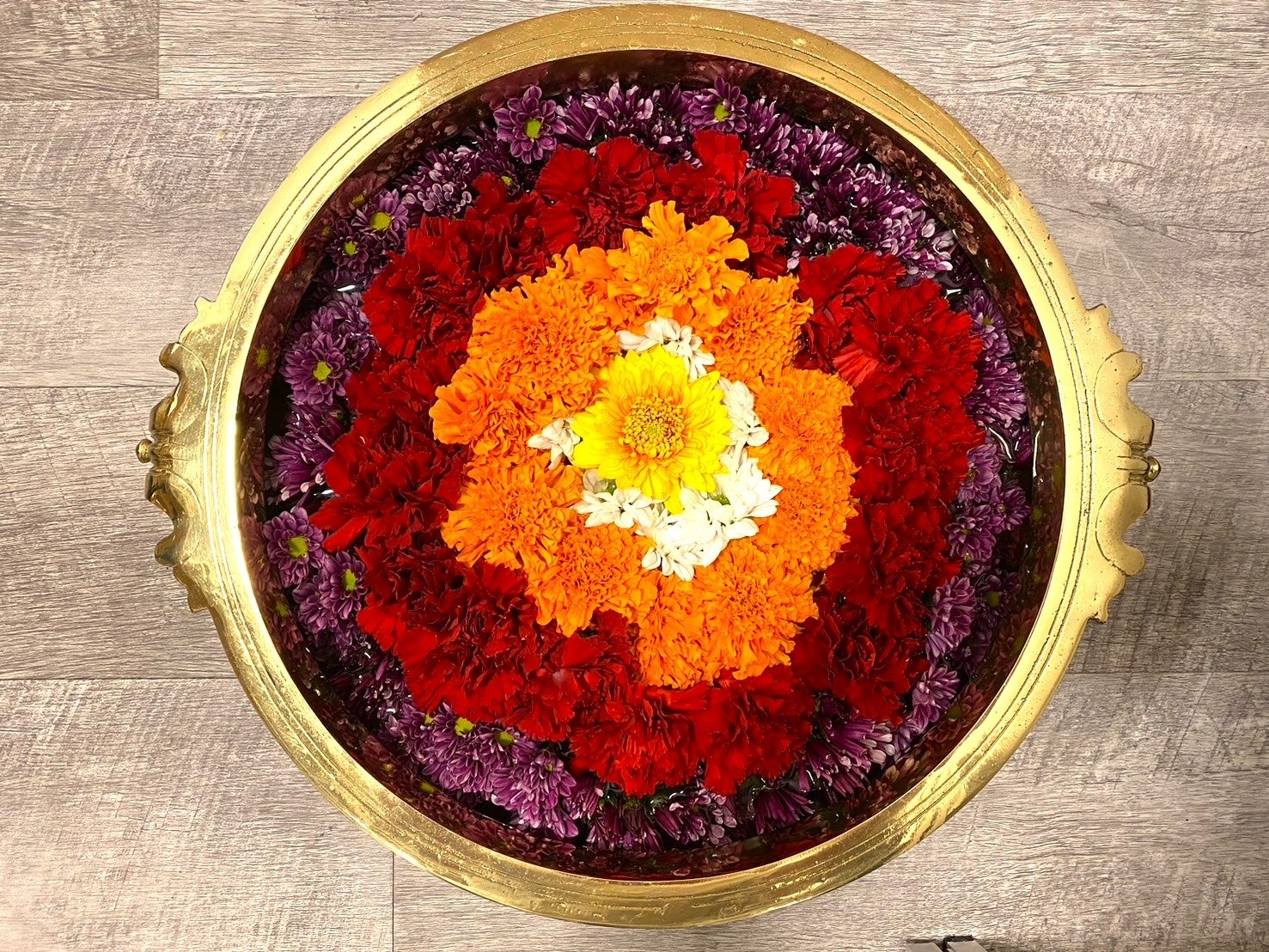 オナムフェスティバルは、インドのマラヤーラム暦におけるチンガム月(8月~9月)の最後の10日間に行われ、宗教やカーストを問わず、ケララ州の人々によって州全体で喜びと熱意をもって祝われる祭りです。開催時には花や色砂を用いて、オナムプーカラムと呼ばれる円形の装飾(またはフラワーカーペット)がいたるところで作られ、花びらが舞い降り、街中に彩りを添えます。 提供する料理はサディヤ(=ごちそう)と呼ばれ、バナナリーフの上にこの日だけしか食べられない約25〜30種類の料理をサーブしていきます。