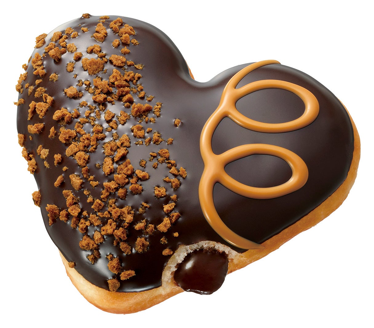 『メルティ リッチ ハート』は、レンジで11秒温めると、チョコがトロッととろける贅沢なドーナツです。ハート形の生地にビターチョコを重ね、キャラメル風味のラインでクルクルと遊び心ある模様を描きました。中に詰めたチョコクリームのなめらかな味わいと、トッピングのチョコクランチのサクッとした食感が、口の中で溶け合います。