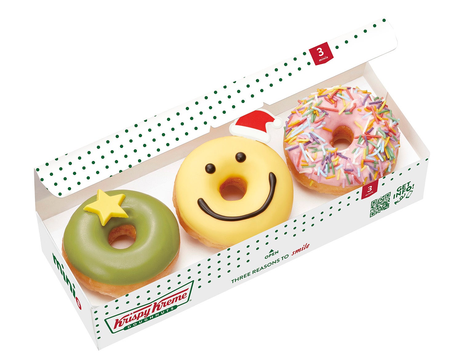 ※2024年12月21日(土)~25日(水)の期間、『ストロベリー ミルク クリーム サンタ』『キャラメル トナカイ リング』『チョコレート スノーマン』『ピスタチオ クリーム ツリー』の4種の単品販売及び、『ホリデー ボックス(3個)』の販売を中止します。ホリデードーナツをより多くのお客様に楽しんでいただく為、該当商品の販売を指定のボックス販売に限定させていただきます。