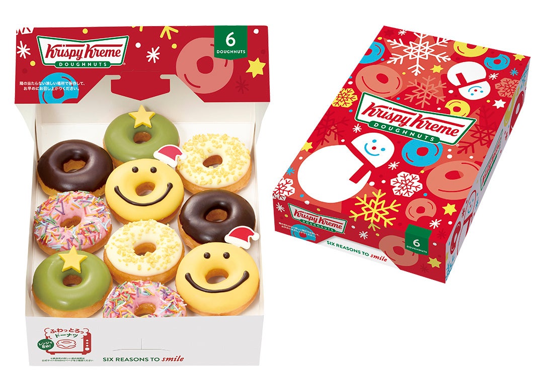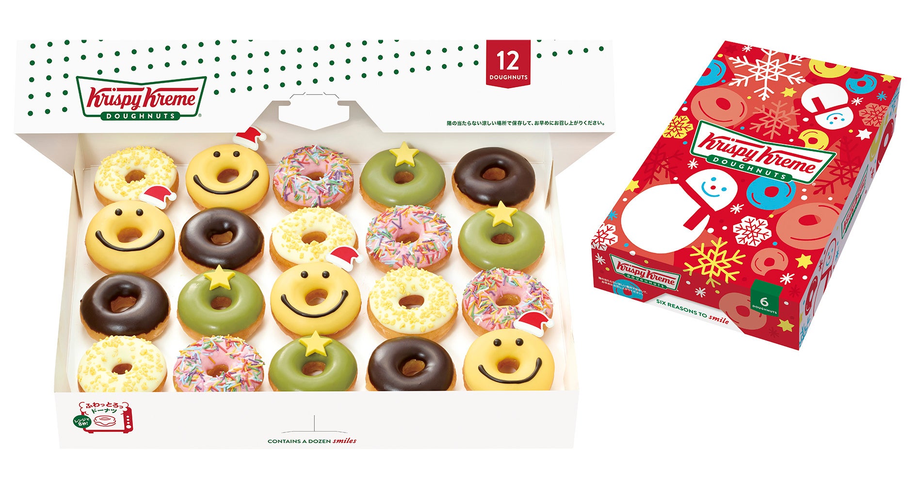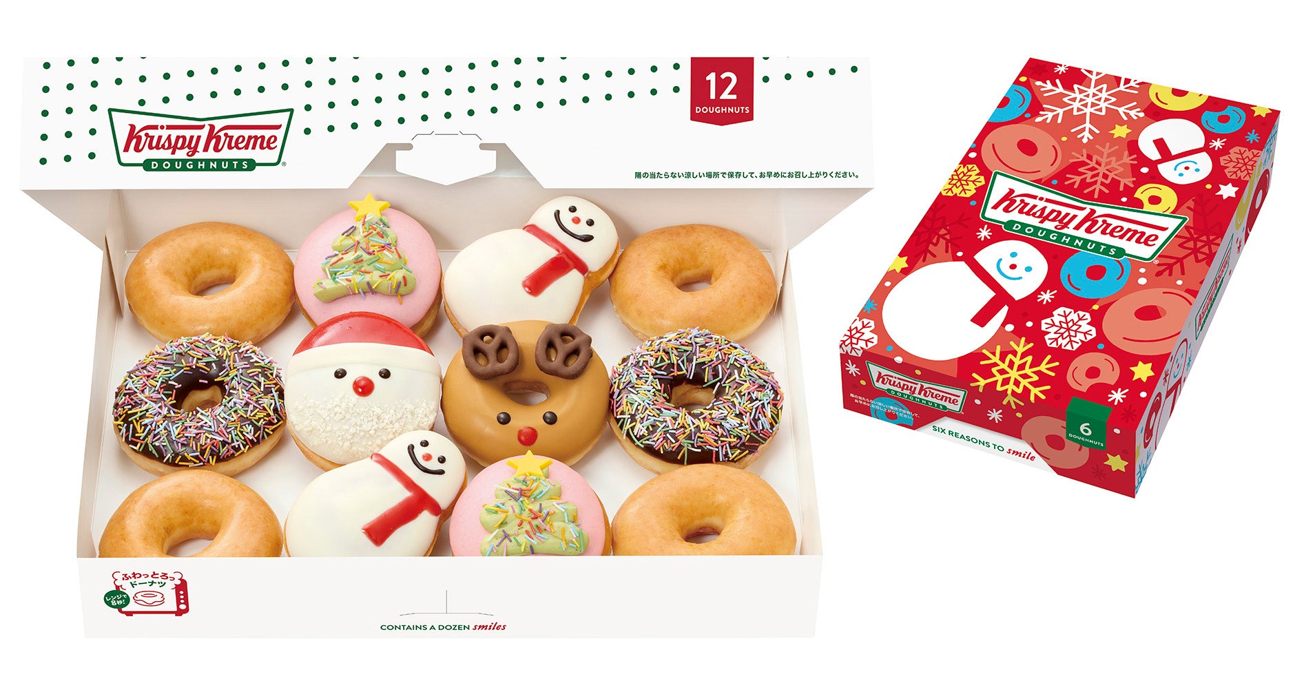 ストロベリー ミルク クリーム サンタ、キャラメル トナカイ リング、ピスタチオ クリーム ツリー、チョコレート スノーマン。人気のオリジナル・グレーズド®も一緒の12個入り。家族や友達と集まって、心がキラキラ輝く時間を。