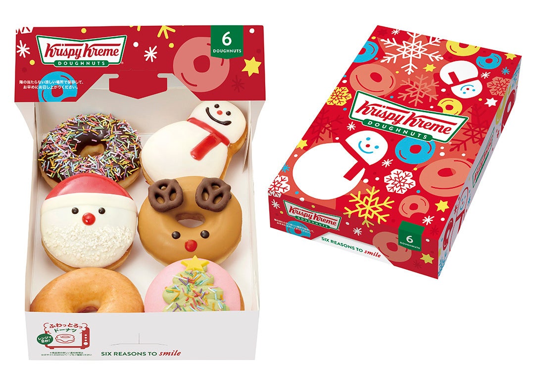 ホリデーをおいしく彩るストロベリー ミルク クリーム サンタ、キャラメル トナカイ リング、ピスタチオ クリーム ツリー、チョコレート スノーマン。人気のオリジナル・グレーズド®も一緒の6個入り。スイートな笑顔あふれる楽しいホリデーを。