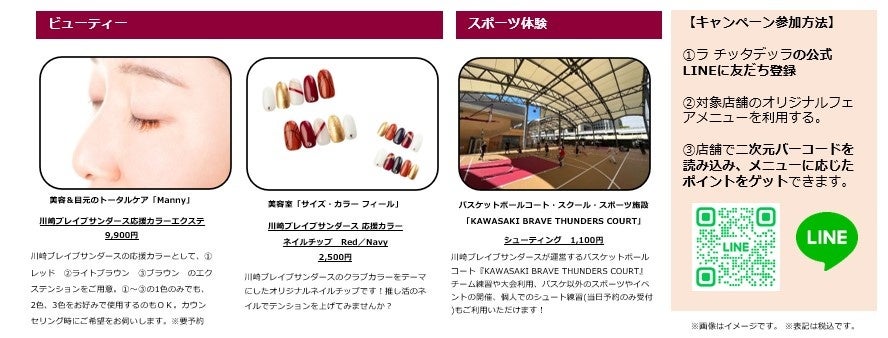 2024年1月26日(金)からシーズン終了までの期間中、ラ チッタデッラ内の各店舗にて「川崎ブレイブサンダース」を応援するオリジナルフェアメニューが登場!上記期間中、対象メニューご利用の方に、オリジナルノベルティカードほか、限定グッズや豪華賞品を各種ご用意しております。