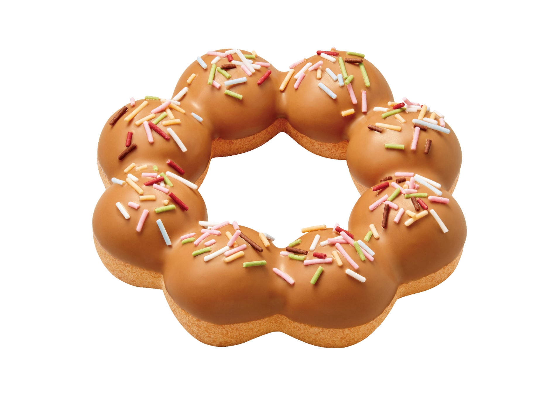 ポン・デ・リング生地にキャラメル風味チョコをコーティングしてカラーシュガーをトッピング。