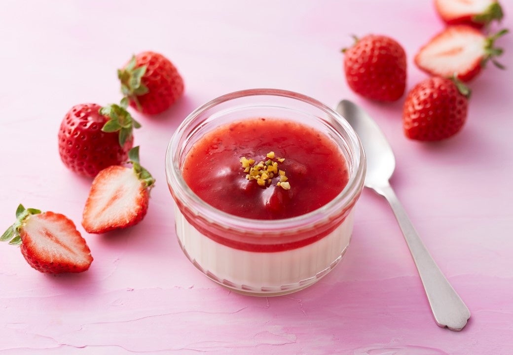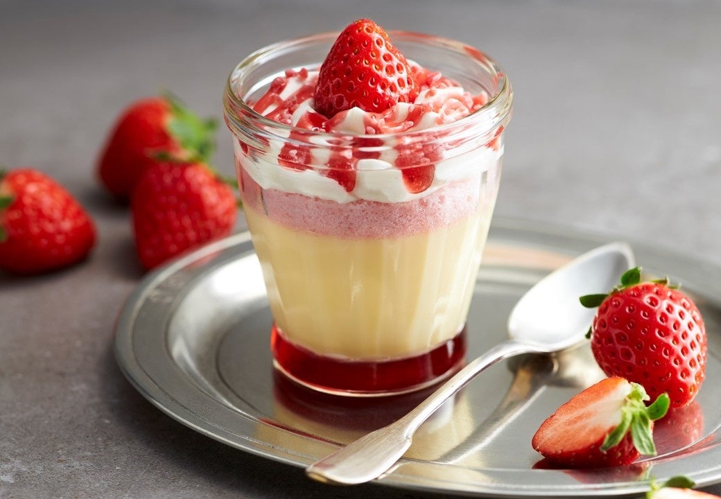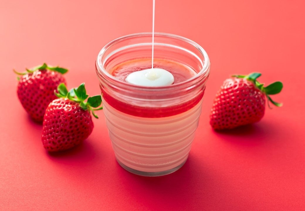 ミルク感のあるやさしい甘さのいちごプリンに、より“いちご感”を感じていただけるつぶつぶとした果肉食感を残した色鮮やかないちごゼリーを重ねました。いちごの甘酸っぱさや果実感を楽しめる2層仕立ての濃厚ないちごのプリンに、専用の練乳ソースをかけてお楽しみください。