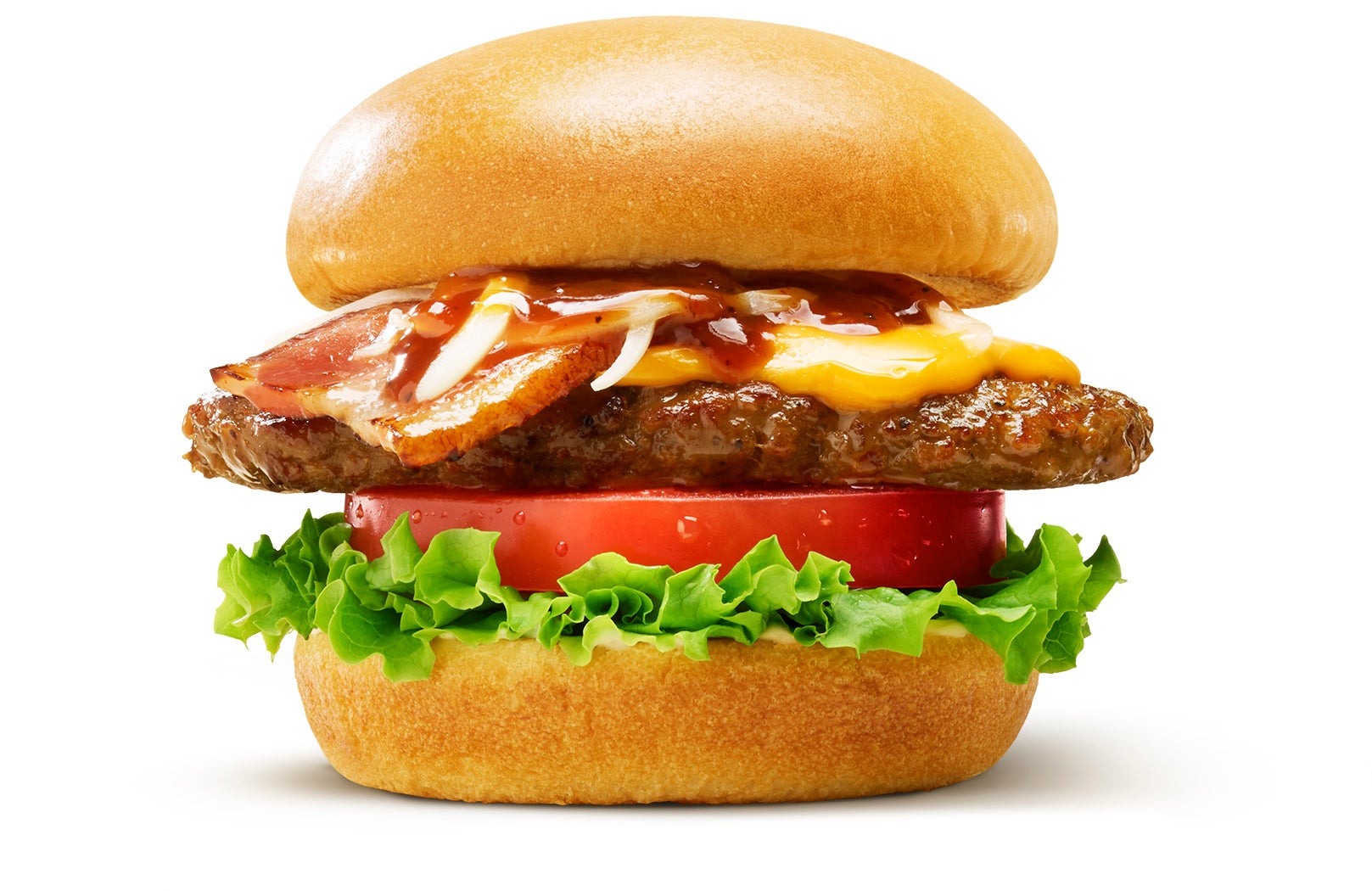 グリーンリーフとトマトの上に、国産牛100%使用のパティ、北海道チーズをのせ、オニオンスライス、和風BBQソースを合わせました。パティは食べ応えがありながら、脂の旨みも楽しめるよう、バランスよく配合しています。食べ応えのあるパティには、燻製の香りが特徴の和風BBQソースと、ゴーダ、チェダー、パルメザンなど複数のチーズを使用した北海道チーズをバランスよく合わせました。国産牛パティの旨みと和風BBQソースのスモーキーな香り、そしてチーズの風味が食欲をそそる贅沢な一品です。